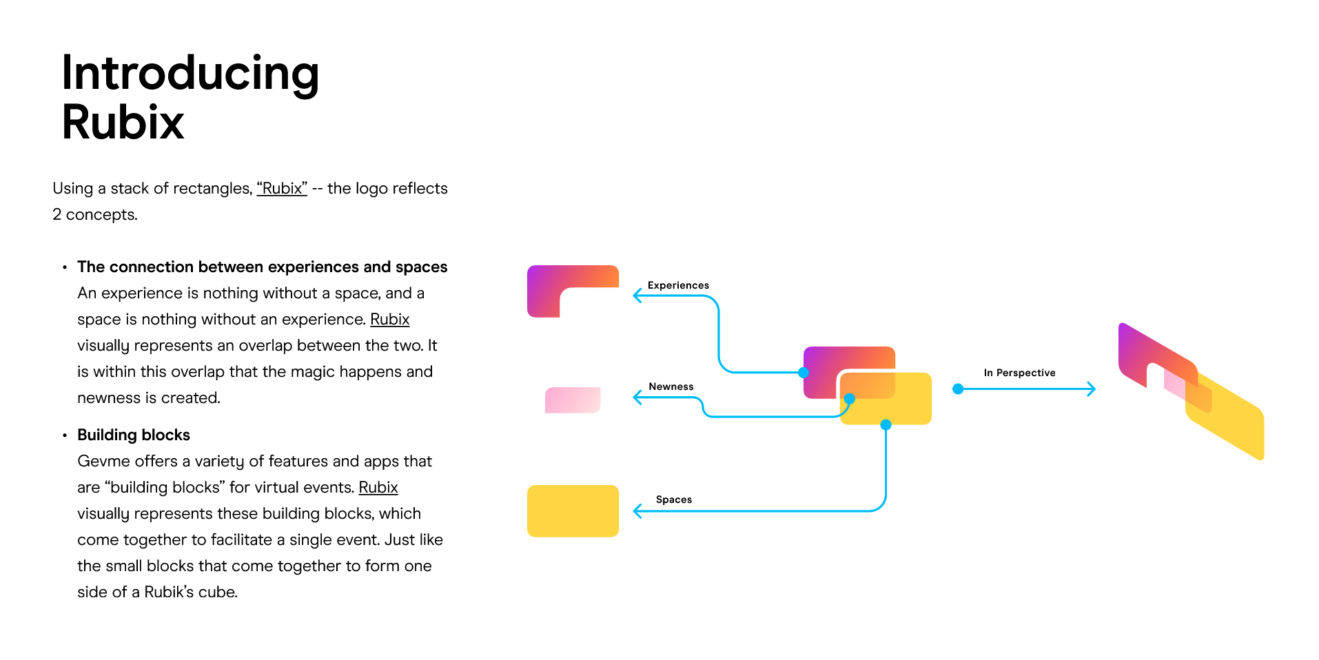 Gevme's logo lockup effectively conveys the brand's core products: events. Using a stack of rectangles named "Rubix", the logo embodies two key concepts.